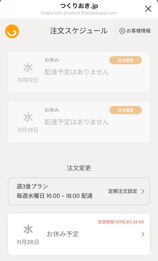 ツクリオでは公式サイトで配送指定し、配送が不要な週についてはキャンセルすることができます。